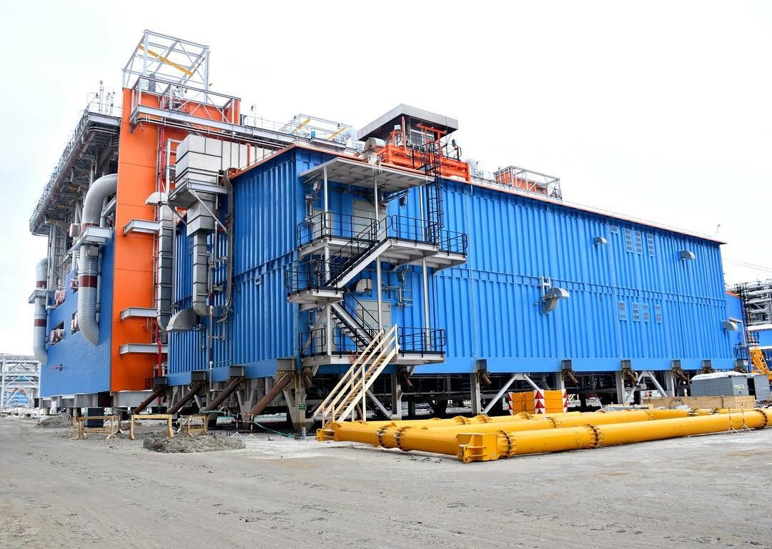 На проекте Ямал СПГ наступил пиковый момент строительства. За последний месяц на второй технологической линии завода уже смонтированы и установлены пять производственных модулей. Два модуля — это подстанции, осуществляющие электропитание и регулирующие напряжение оборудования. И три модуля трубопроводной эстакады, весом 5 844, 4 167 и 3456 тонн каждый, предназначены для соединения технологических линий завода. Это смонтированный модуль 214-PAB-215, трансформаторная подстанция.