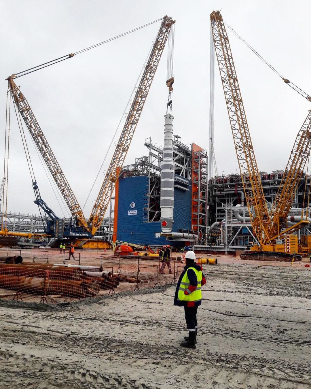 При подъеме в вертикальное положение использовались два крана: 1600 тонн и 350 тонн.