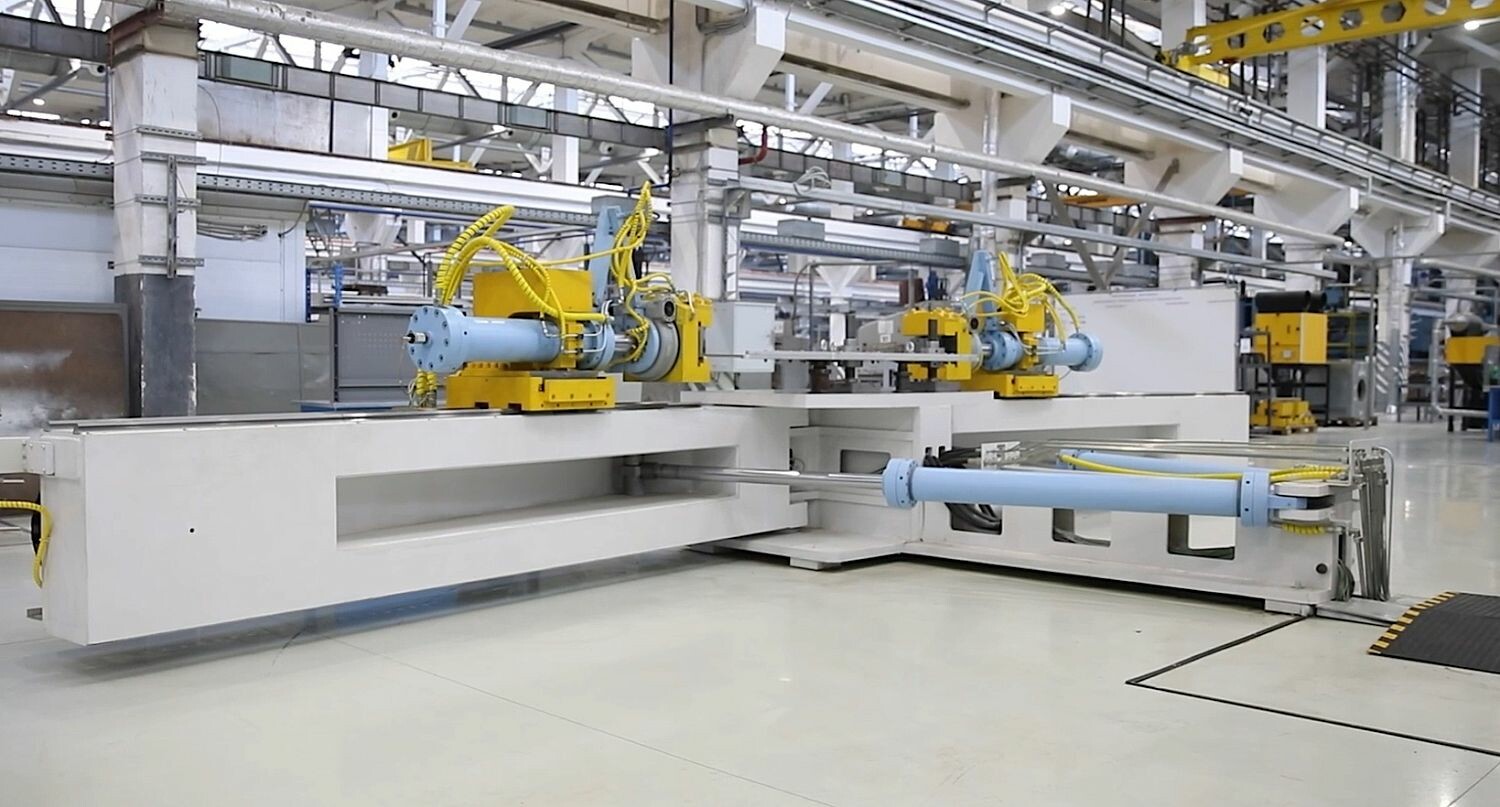 Пресс ПГР-6АД1 предназначен для производства деталей обшивки самолетов, железнодорожных вагонов и спецтехники. Он работает с алюминиевыми профилями сложных форм (уголок, тавр, Z- и П-образные сечения) размером 6500×150×100 мм.
