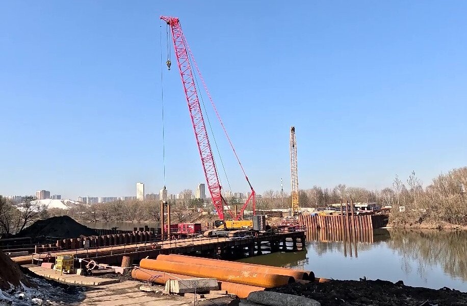 © max.ru Нацпроектстрой продолжает строительство велопешеходного моста через Москву-реку в створе Островной улицы — в дно погружают трубосваи.