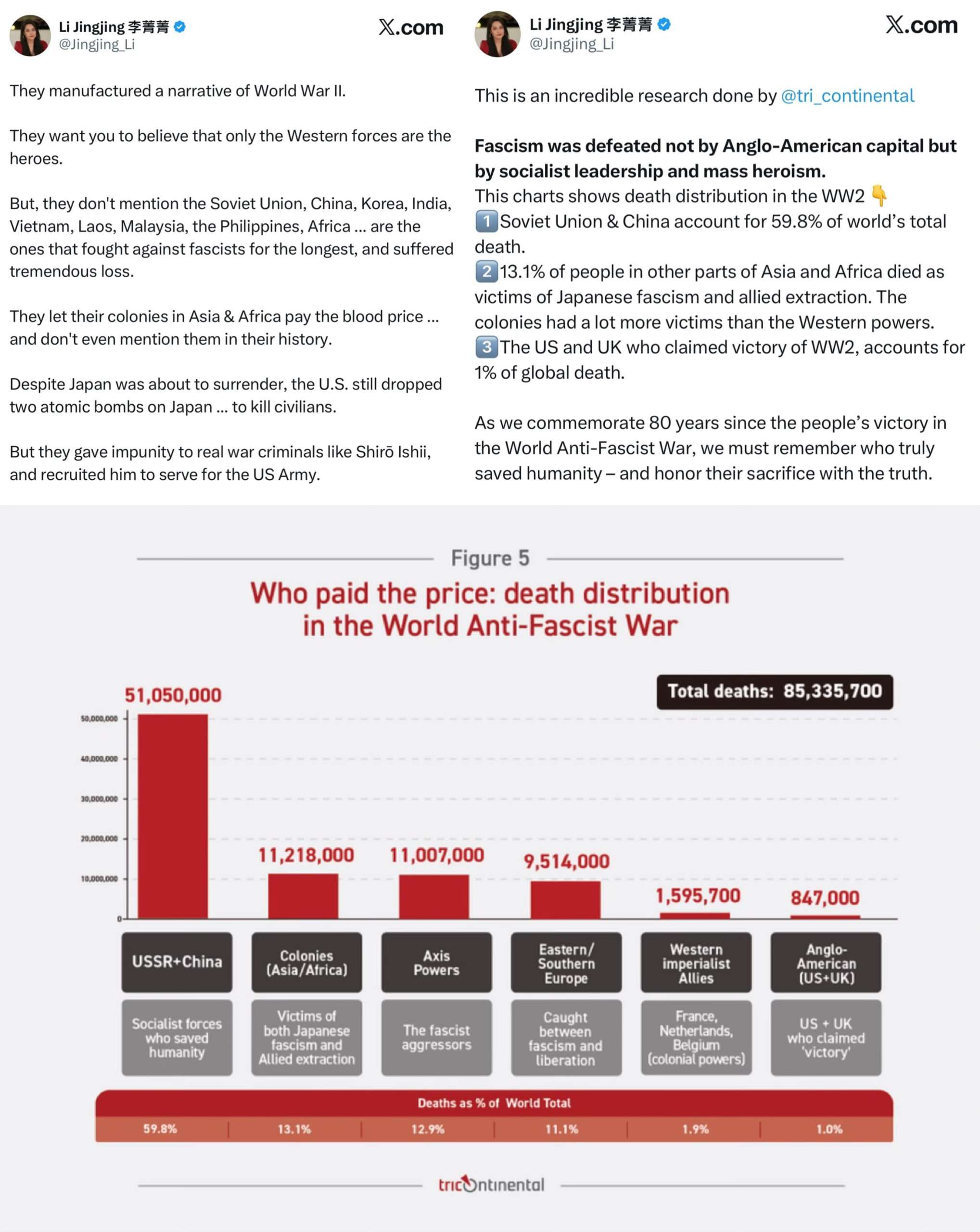 Что числа, что формулировки, что детали — заглядение. СССР+Китай, «те кто спасли человечество», отдельно выделены колонии (господи, в Гонконге верующие в то, что Японию практически в одно лицо разгромили прямо тут, тронутся), «западные союзники империализма» с пометкой «кстати колониалисты», и в финале «US+UK, которые заявляются как «победители», с кавычками.» (полностью по ссылке) https://t.me/prchand/13916